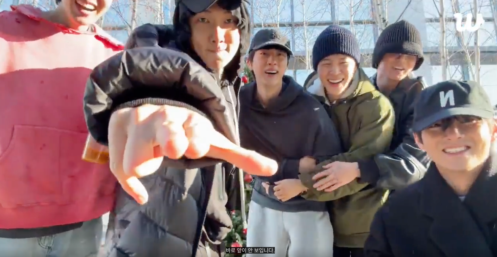 V (not letting any members have a moment of peace): JungKookie hasn't shared his new year's wish ..Jung Kook come to the middle ..say yours.. (pushing him to the front)