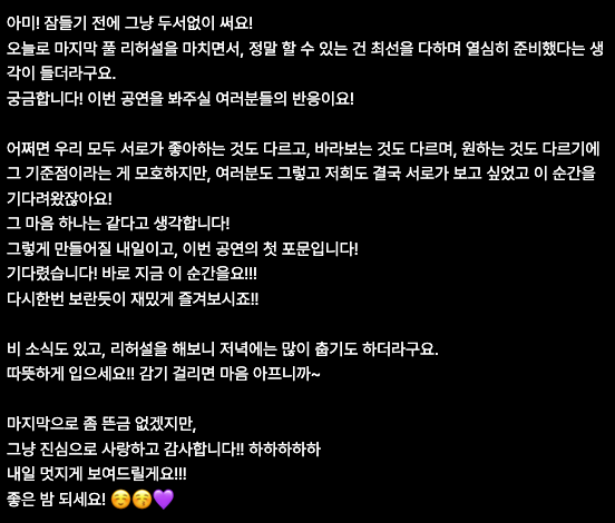 어쩌면 우리 모두 서로가 좋아하는 것도 다르고, 바라보는 것도 다르며, 원하는 것도 다르기에 그 기준점이라는 게 모호하지만, 여러분도 그렇고 저희도 결국 서로가 보고 싶었고 이 순간을 기다려왔잖아요!