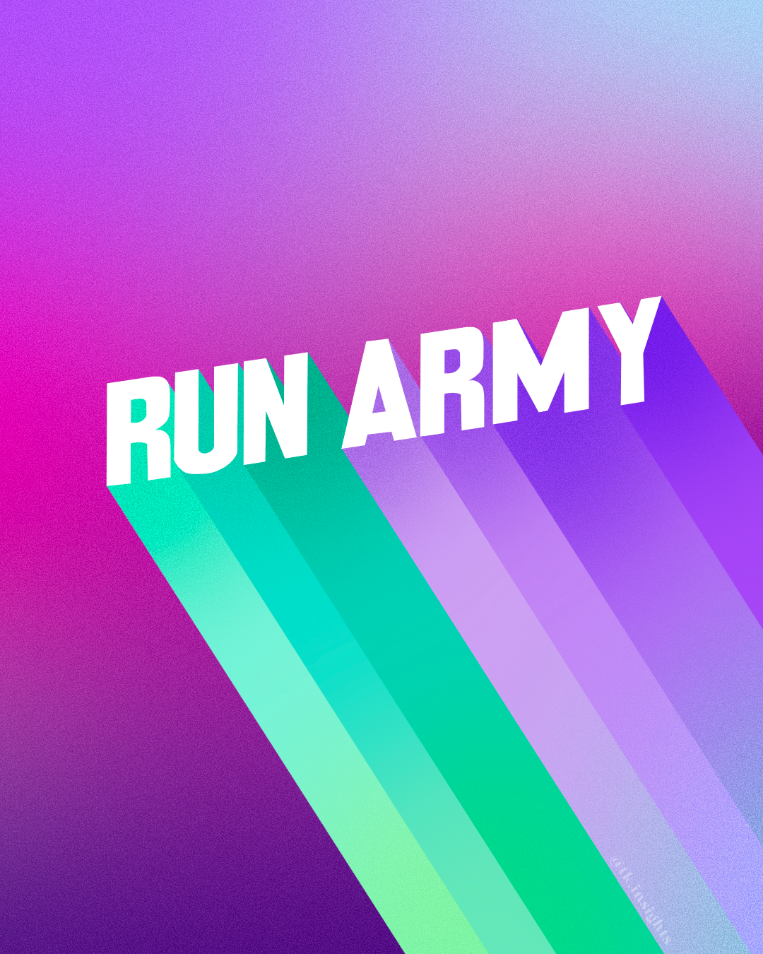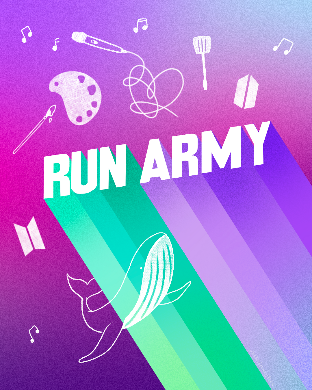 And finally, for anyone that may not know, ARMYs are rallying to post vlogs, life updates, share about hobbies, etc. so that rather than asking BTS to constantly entertain us, we can show up and give THEM content to watch from our side. This initiative, started by @hyyhddaeng on twitter/x is called #RUNARMY - I designed these graphics for it that you're welcome to download to post along with your updates so they can see our GLOBAL collaboration visually.